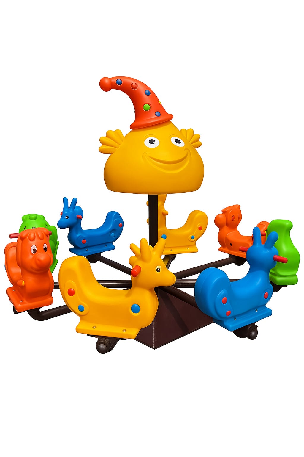 Echipamentul de joacă rotativ vesel și colorat, ideal pentru spațiile exterioare destinate copiilor mici. Conceput sub forma unui carusel cu figurine de animale în culori vii, acest joc stimulează echilibrul, coordonarea și distracția în grup.
